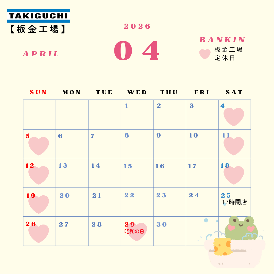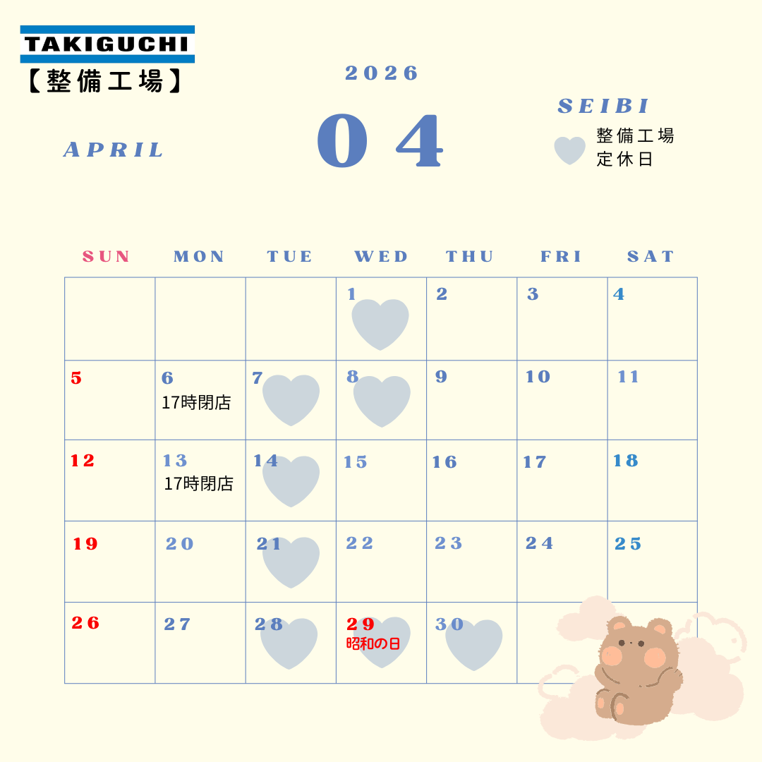 整備工場&板金工場 2026年4月の定休日のお知らせ